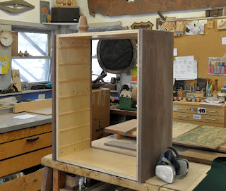 the construction was straightforward. a ply case with drawer runners routed into it, and solid wood sides, top, and face frame. the back is a piece of 1/2" plywood, painted on the outside.