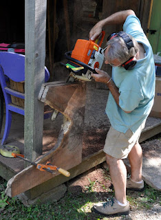 well, friday afternoons ... you just never know what might happen ... as we were cleaning up, somone put this claro slab cutoff out on the porch just as i happened to go out the door to the finish room. this piece has been hanging around the end of the sander for oh, a year or so? who knows. anychoice, i suddently had this urge to clone it by resawing it with a chainsaw. kind of like the rubber stamp tool in photoshop. so i did. jim was johnny on the spot with the photos .... now comes the hard part ... whats the best thing to do with them ??? comments? were open to suggestions ... click the photos to enlarge them ...